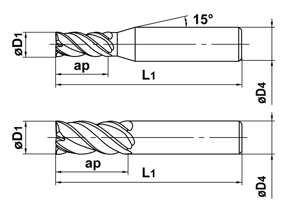 - Ruostumattomille ja kuluttaville materiaaleille soveltuva 4-leikkuinen varsijyrsin.